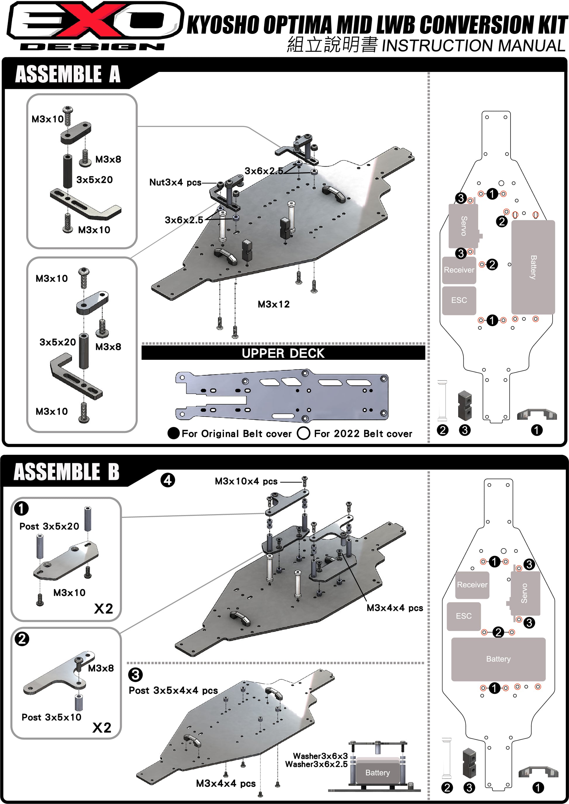 3.Adjustable battery mounting positions. The battery can be placed horizontally through the belt (As stock Kyosho Optima Mid) , or sideways by the belt. Both options are easy to use and prevent battery separated from the vehicle during the race.