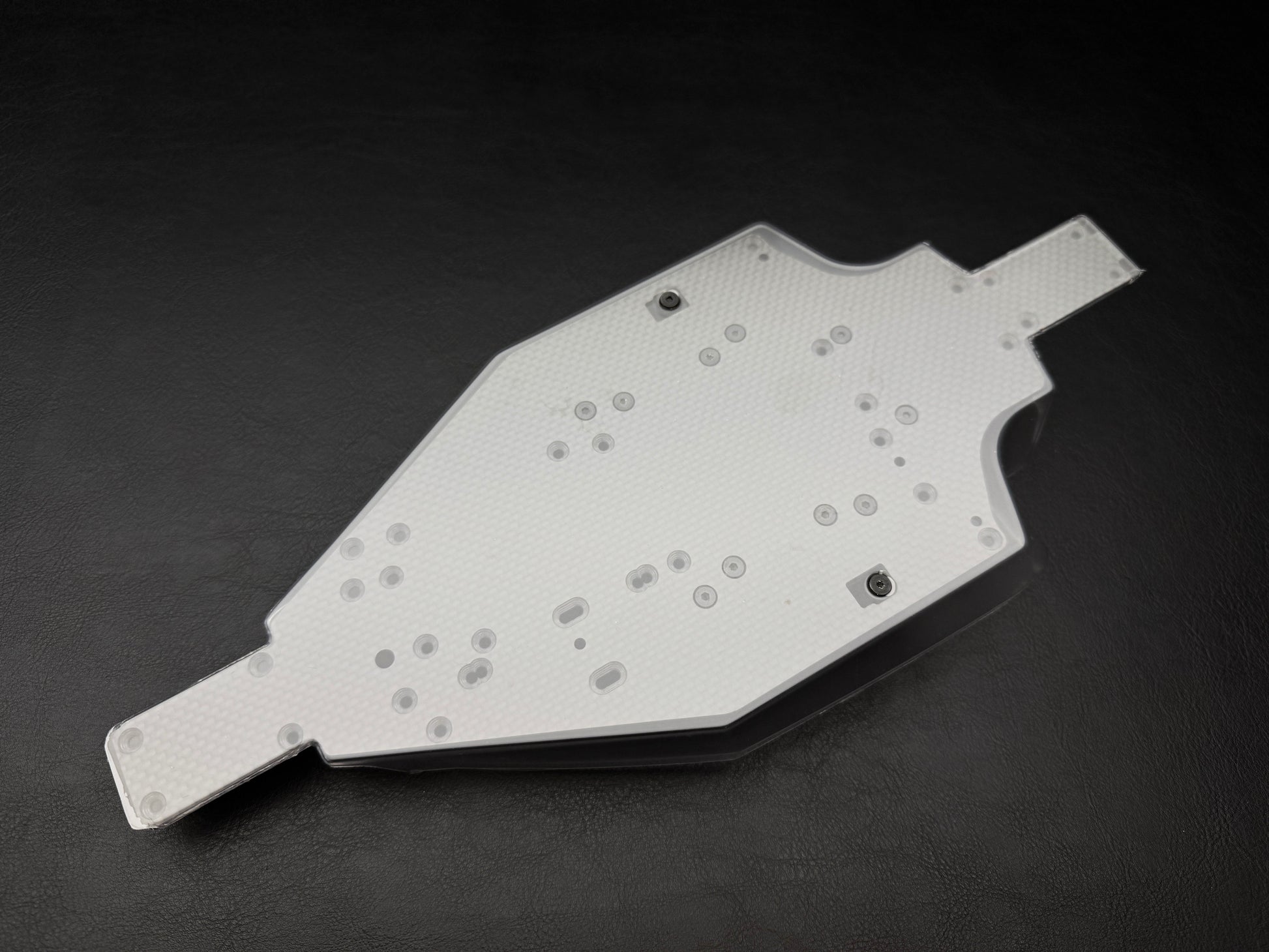 2.Reenforced front and rear shock towers (3.5mm) Compatible with modern 1/10 buggy shock systems (PR racing SB401R front and rear shocks as shown in pictures). Extra mounting positions on shock towers are available for fine tunings.